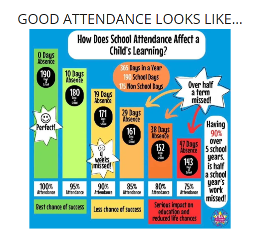We believe that the most important factor in promoting good attendance is the development of positive attitudes towards school. To this end, we strive to make our school a happy and rewarding experience for all children. We will reward those children whose attendance is very good. We will also make the best provision we can for those children who, for whatever reason, are prevented from coming to school.