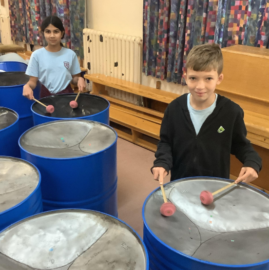 We also enrich the curriculum through wider musical experiences. Pupils take part in activities such as steel pan workshops, visiting performances and whole‑school singing events, giving them the chance to experience music beyond the classroom and explore different musical traditions.