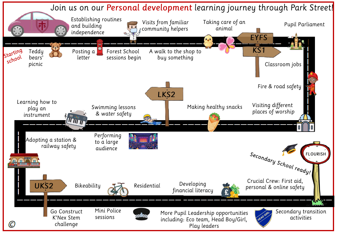 At Park Street, Personal Development sits at the heart of everything we do. We want every child to grow into a confident, responsible and well‑rounded young person, ready for the next stage of their education and life beyond primary school. Through a carefully planned journey from EYFS to Year 6, we build independence, character, resilience and ambition.